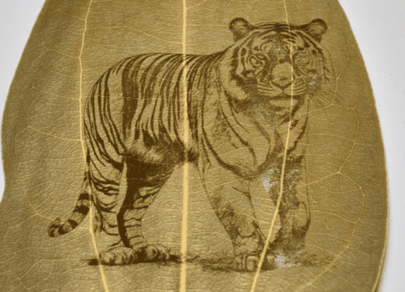 This was one of the most surprising results. Dried leaves are extremely fragile, and most lasers would burn them instantly. In contrast, the UV laser engraved the tiger pattern cleanly without damaging the leaf at all.