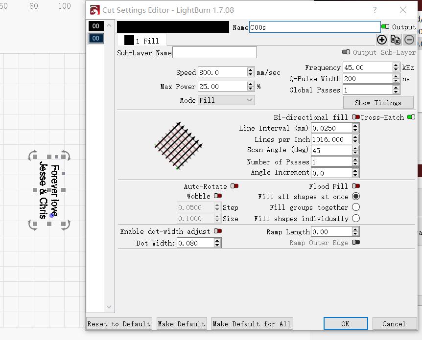 These settings are designed for precision and clarity, ensuring that text is engraved deeply enough to be visible but without damaging the material. The “Cross Hatch” pattern fills in the letters with fine lines, creating a high-quality finish on the jewelry piece.