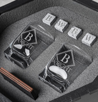 Design idea: Monogrammed whiskey glasses paired with a bottle of spirits.